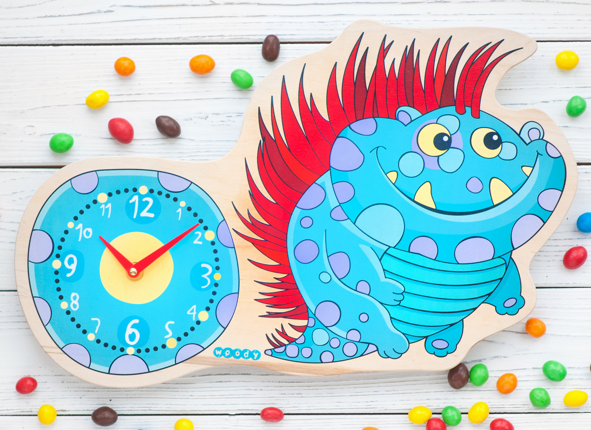 Часы в детскую комнату с весёлым монстриком Люмиком: играя учимся определять время по стрелкам и получаем наслаждение для глаз!