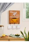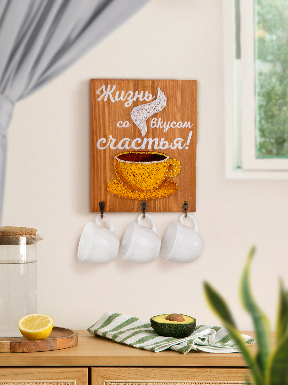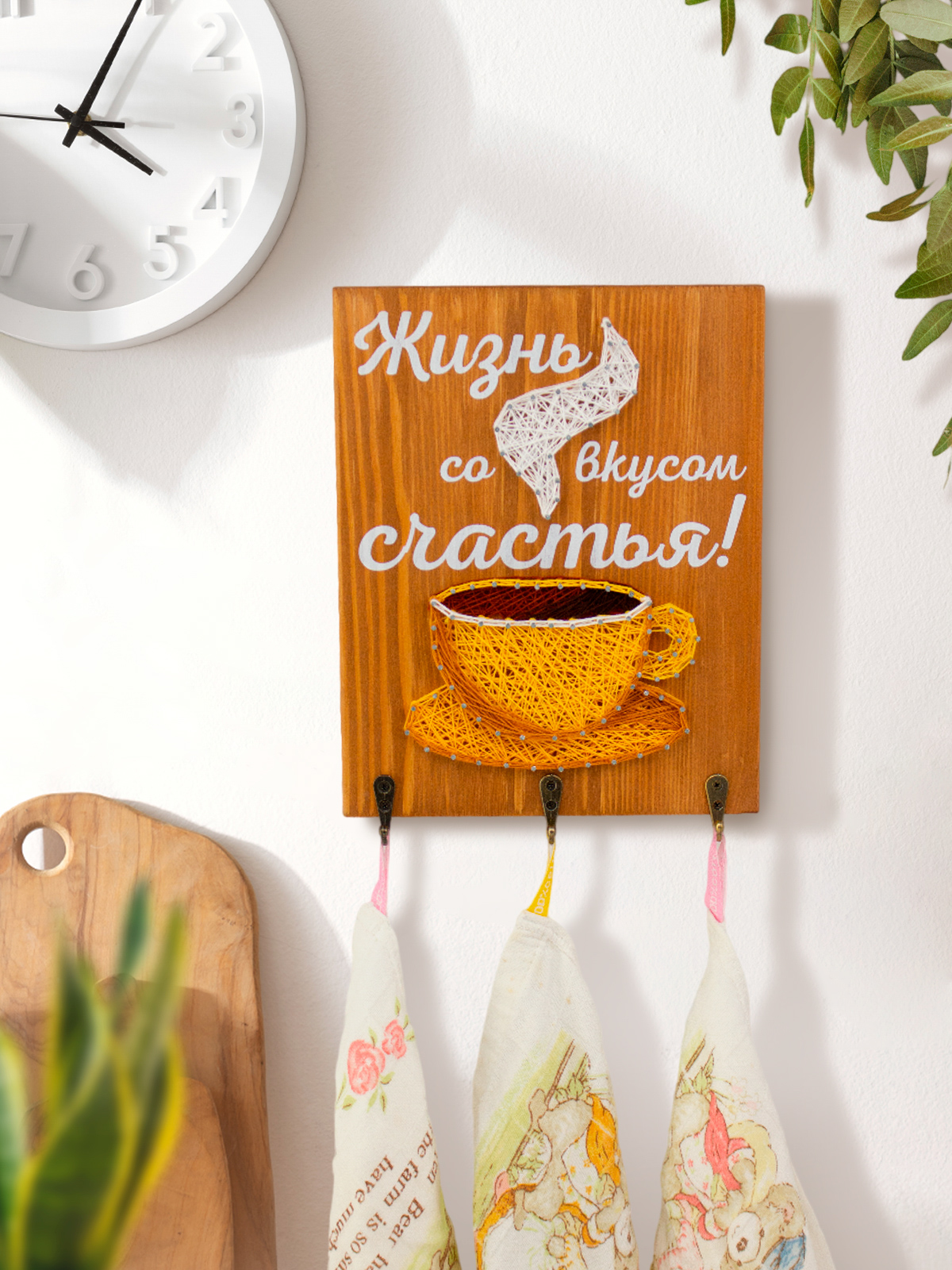 Оригинальная картина с полезной функцией имеет стильные крючки для кухни. Вы можете красиво оформить чайно-кофейную зону, использовать крючки для полотенец, прихватов, кружек. Такой арт-объект будет радовать глаз и удивлять гостей.