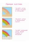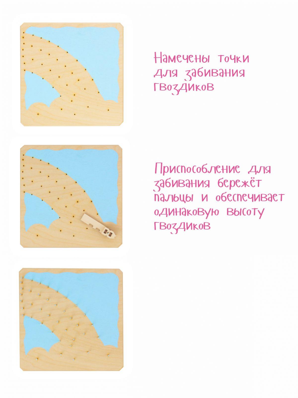 На деревянную основу небесного цвета в намеченные отверстия вбиваем гвозди молотком из своей мастерской. Для обеспечения безопасности используем специальный держатель для гвоздей. Вначале обводим контур нижнего цвета радуги ниткой, зацепив её за каждый гвоздик, затем «закрашиваем» нитью этот цвет, и вновь закрепляем контур для большей чёткости картины. С двумя другими радужными цветами поступаем таким же образом.