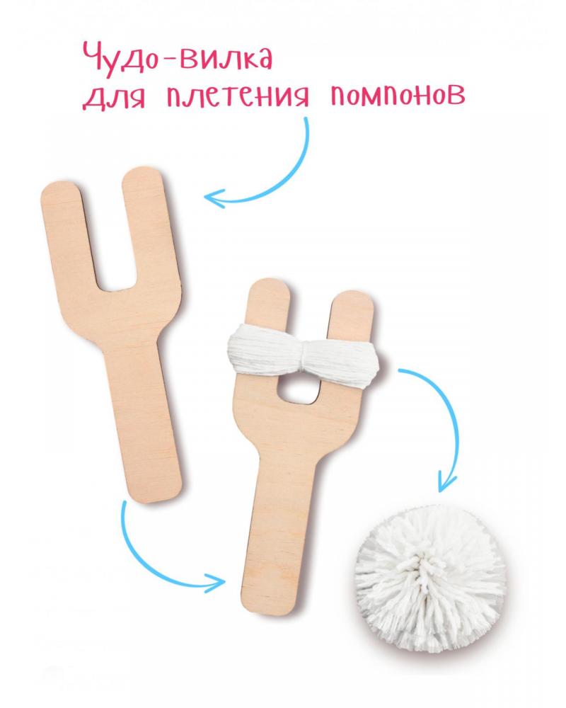 А теперь самое интересное! В наборе есть чудо-вилка. На неё мы вместо макарон накручиваем нитки – много-много раз, скрепляем ниткой в середине, разрезаем по краям, и пушистые летние облака готовы укутать радугу.