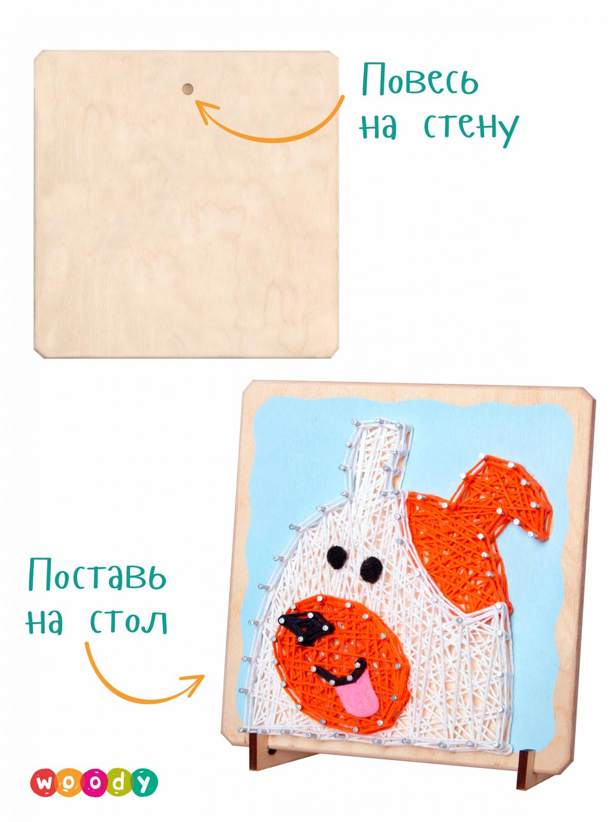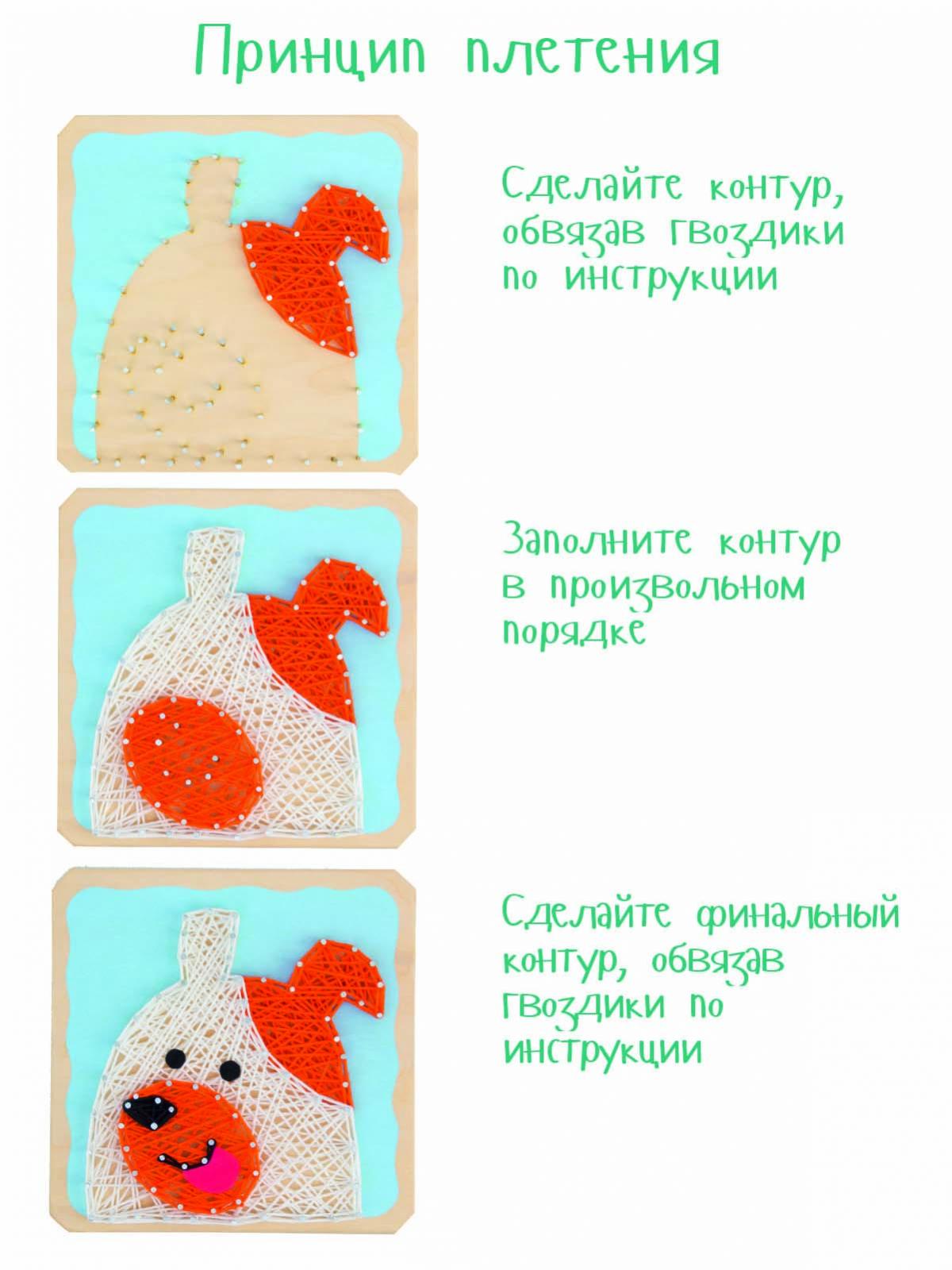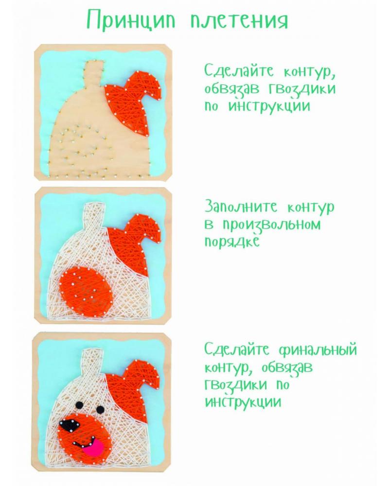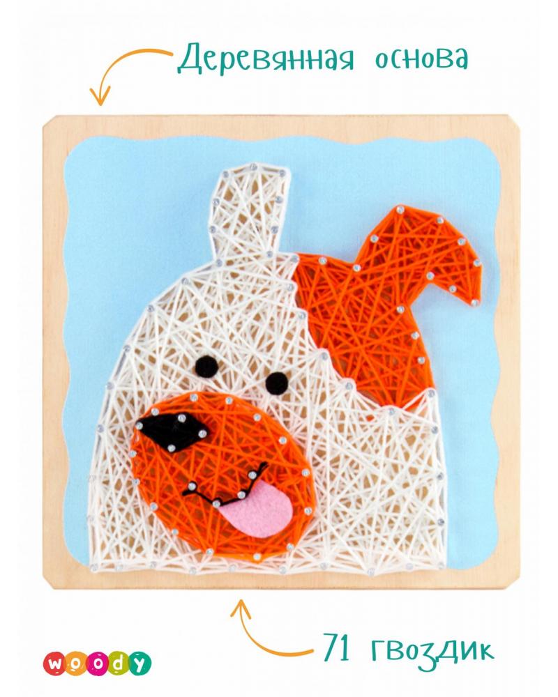 Прежде, чем завести настоящую собаку, лучше испытать свои старание, терпение и аккуратность при создании картины в современной технике. В основу из дерева небесно-голубого цвета с помощью молотка (нужен свой) и держателя вбиваются гвозди по намеченным отверстиям. Нитью одного цвета по гвоздикам наматывается контур, «закрашивается» с помощью нити в произвольном порядке и снова закрепляется контур. Те же действия повторяются  с нитями другого цвета. Мягкий язычок из фетра оживит картину.