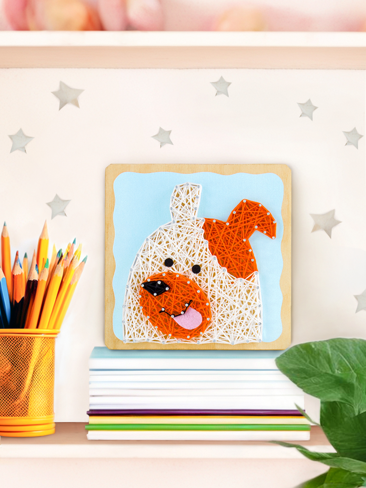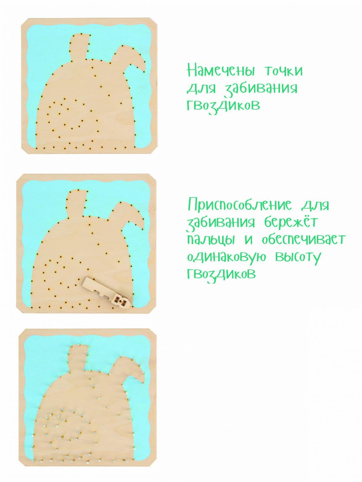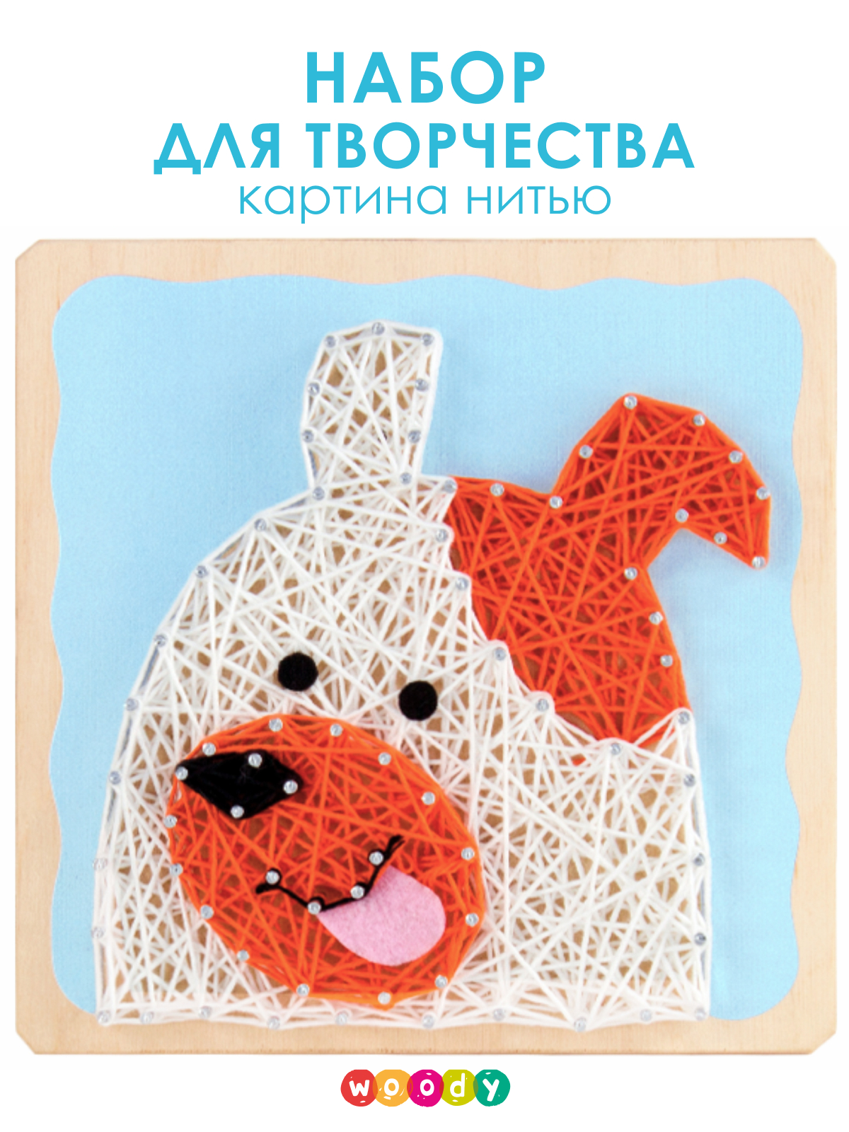 Прежде, чем завести настоящую собаку, лучше испытать свои старание, терпение и аккуратность при создании картины в современной технике. В основу из дерева небесно-голубого цвета с помощью молотка (нужен свой) и держателя вбиваются гвозди по намеченным отверстиям. Нитью одного цвета по гвоздикам наматывается контур, «закрашивается» с помощью нити в произвольном порядке и снова закрепляется контур. Те же действия повторяются  с нитями другого цвета. Мягкий язычок из фетра оживит картину.