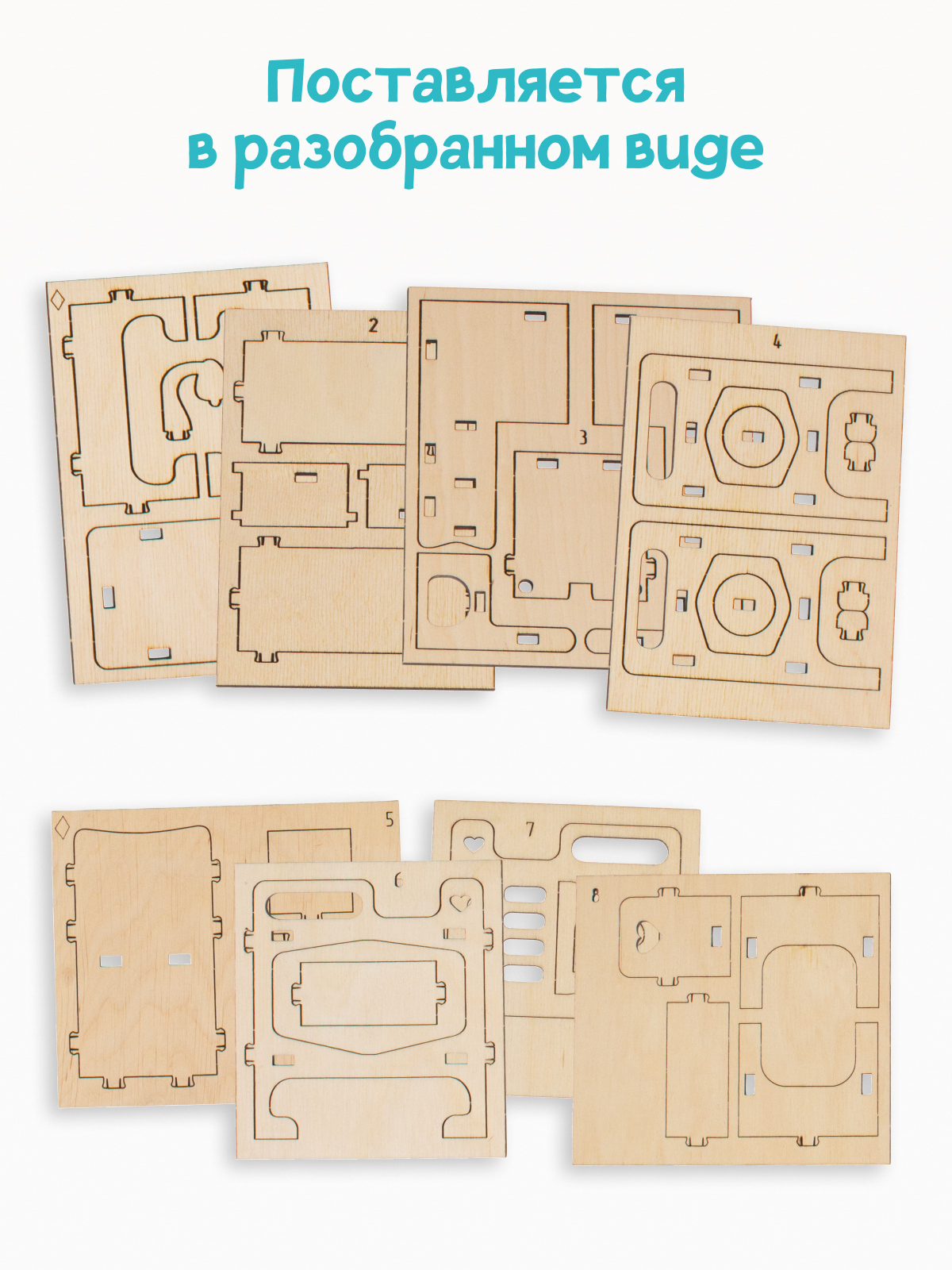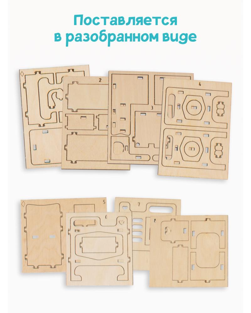 Five items can be assembled from wooden parts: a bed, a shelf, a table, a chair, a lamp. Maximum element height is 102 mm