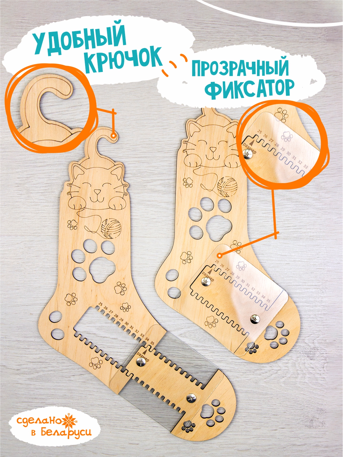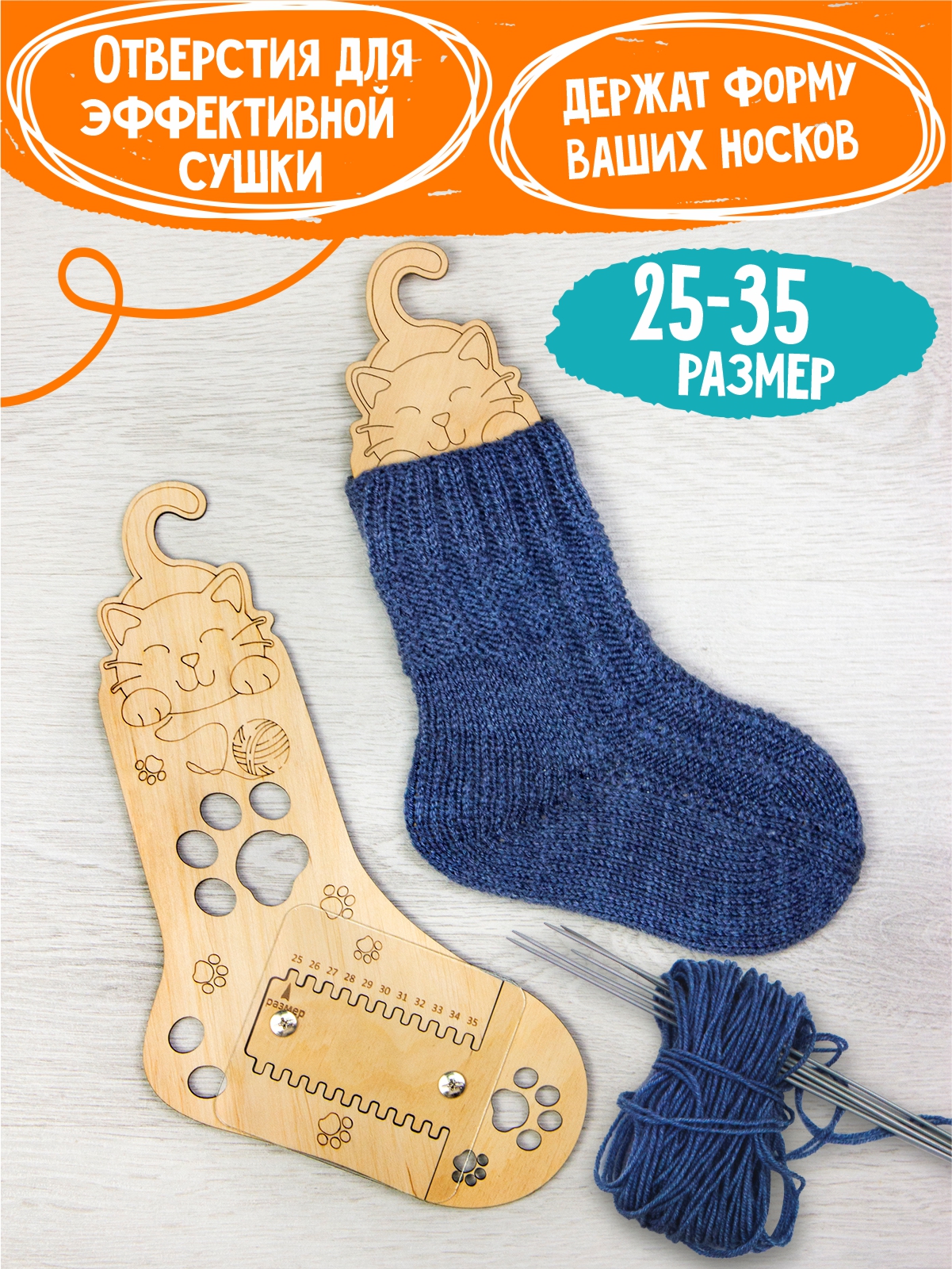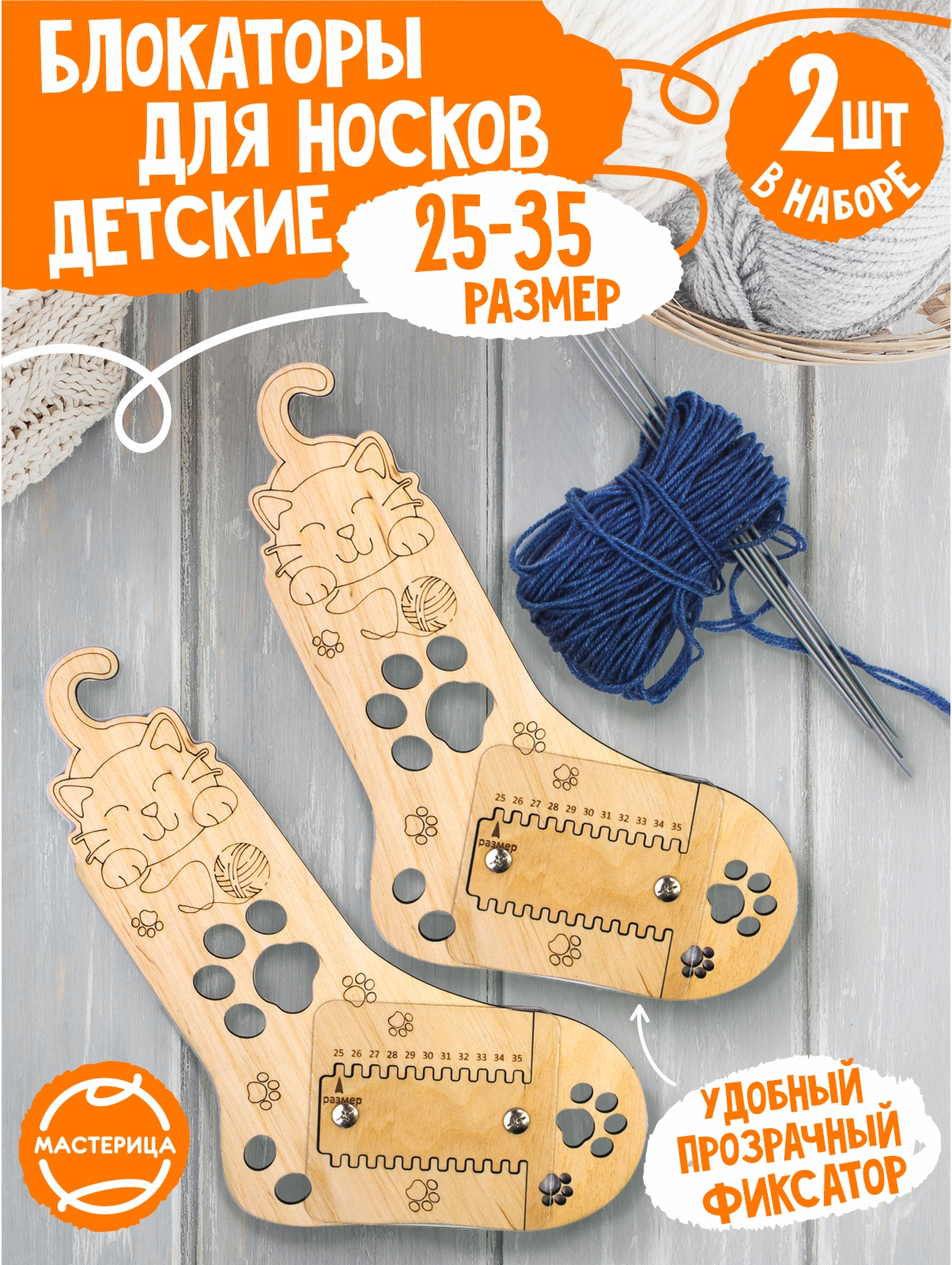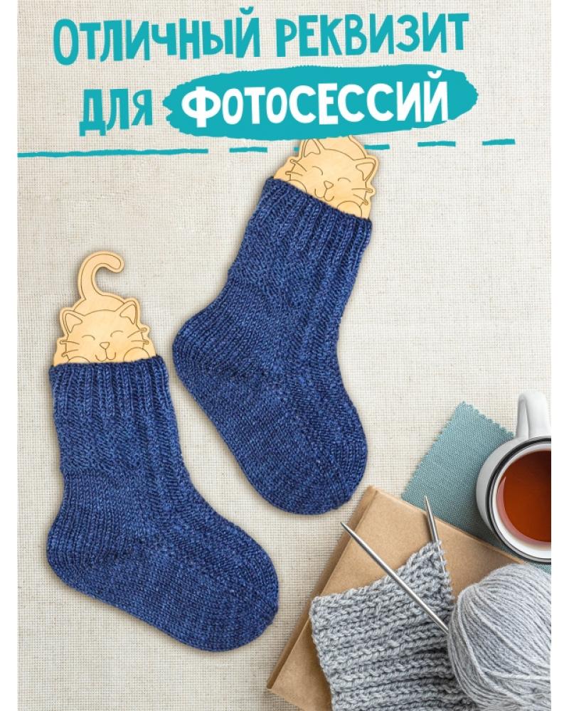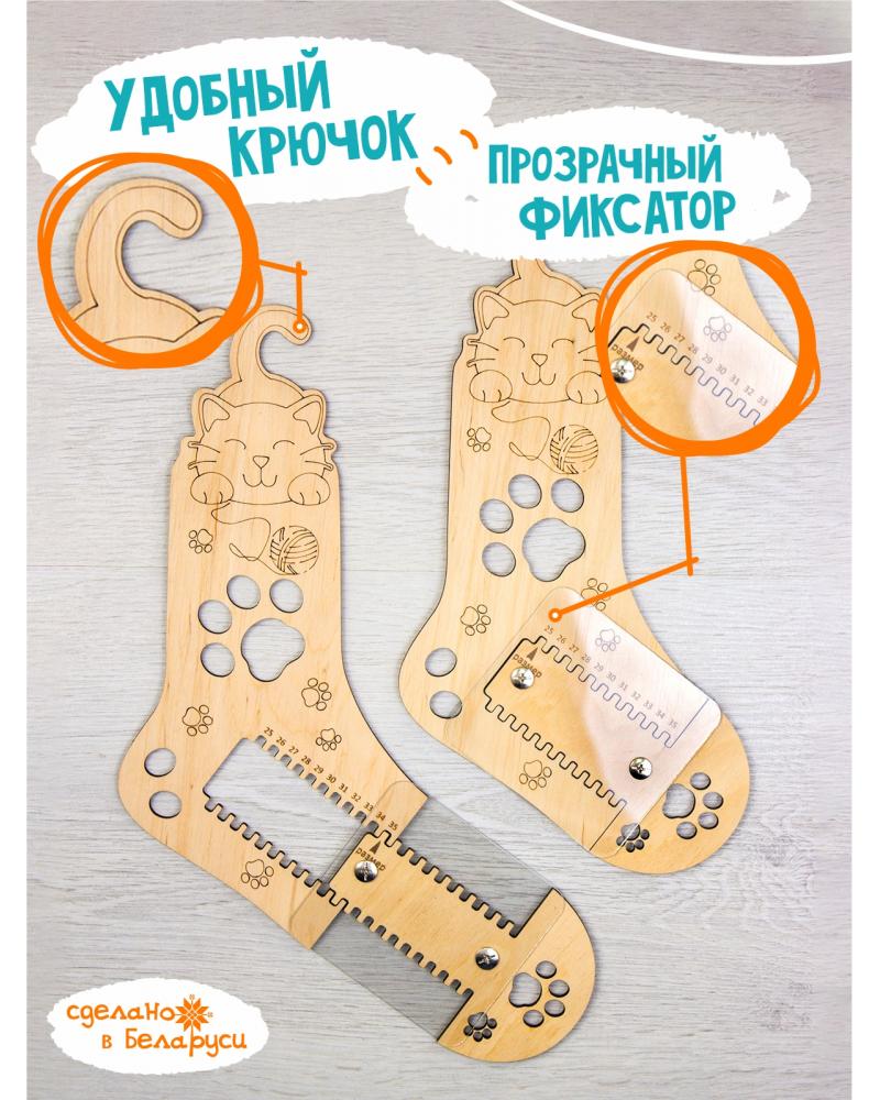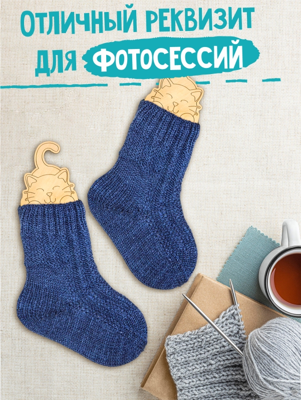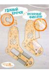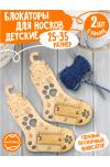 'СОСТАВ НАБОРА. 2 деревянных блокатора с пластиковыми фиксаторами для вязания носков 25-34 размеров. Материал: фанера, пластик.