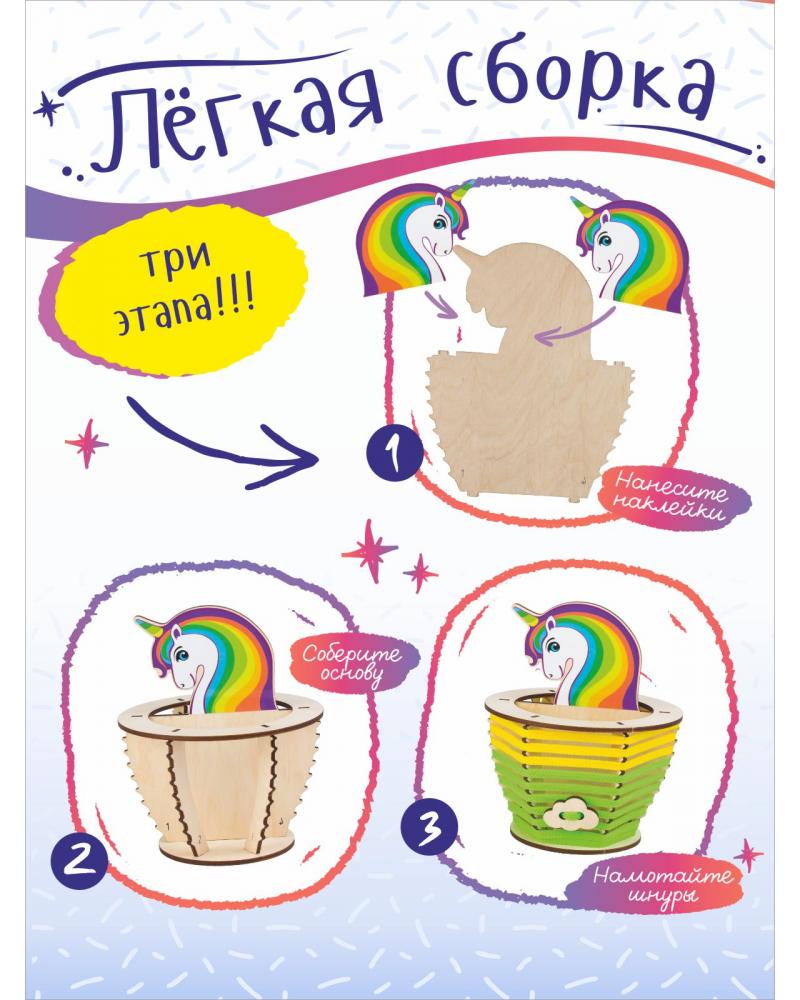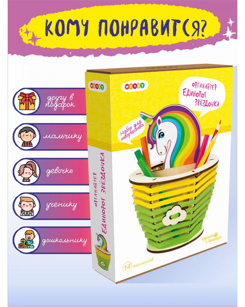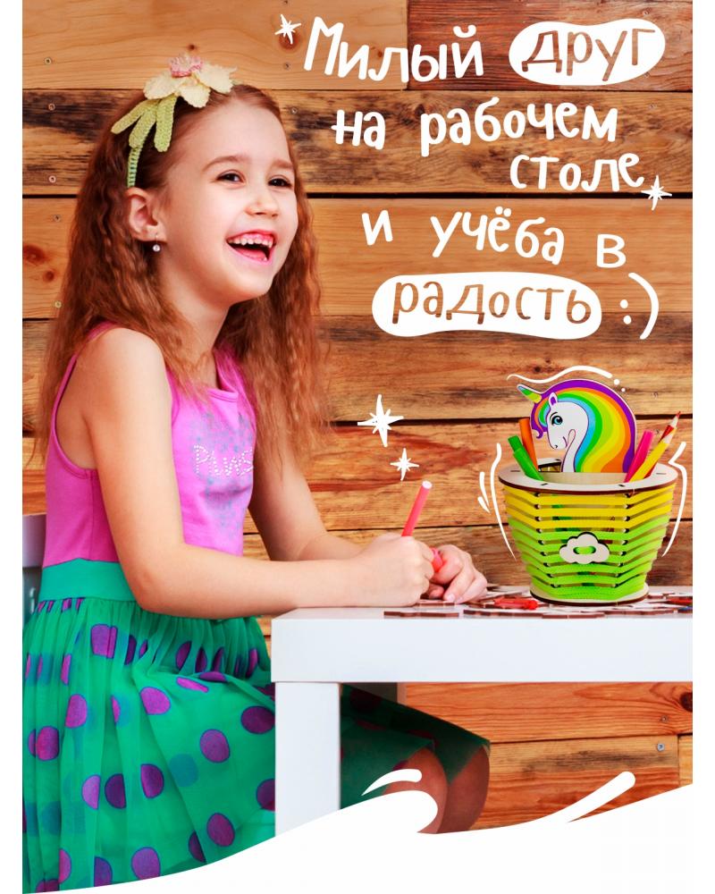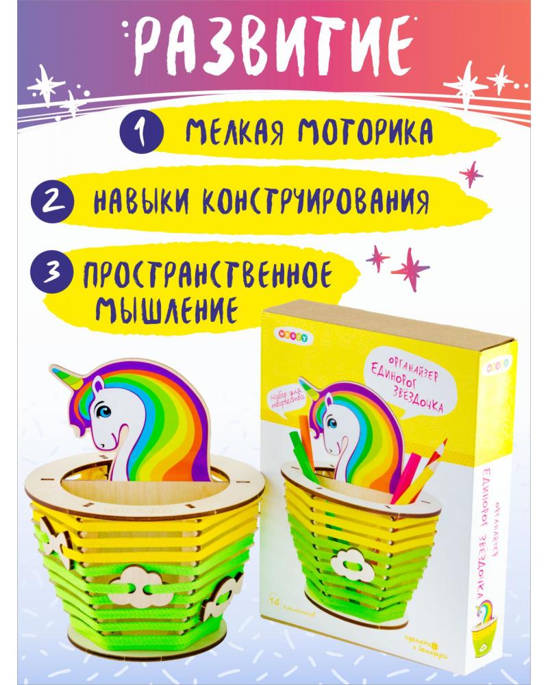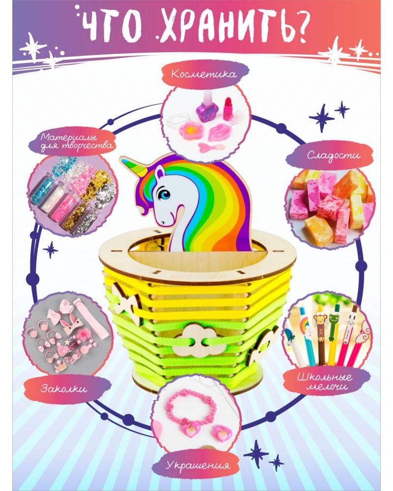 Милые единороги все больше завоевывают внимание детей и взрослых. Это образ сказочной красоты, доброты и мира фантазий. Органайзер «Единорог Звездочка» погружает в творчество детей от 6 лет, и позволяет найти уникальный и просторный домик для важных канцелярских принадлежностей. Основа набора выполнена из дерева – натуральный гипоаллергенный материал, который можно украшать по своему вкусу: разукрашивать карандашами, фломастерами, гуашью или акрилом; приклеивать бусинки, пайетки, стразы или разукрашенные крупы; декорировать объемными формами из пластилина.