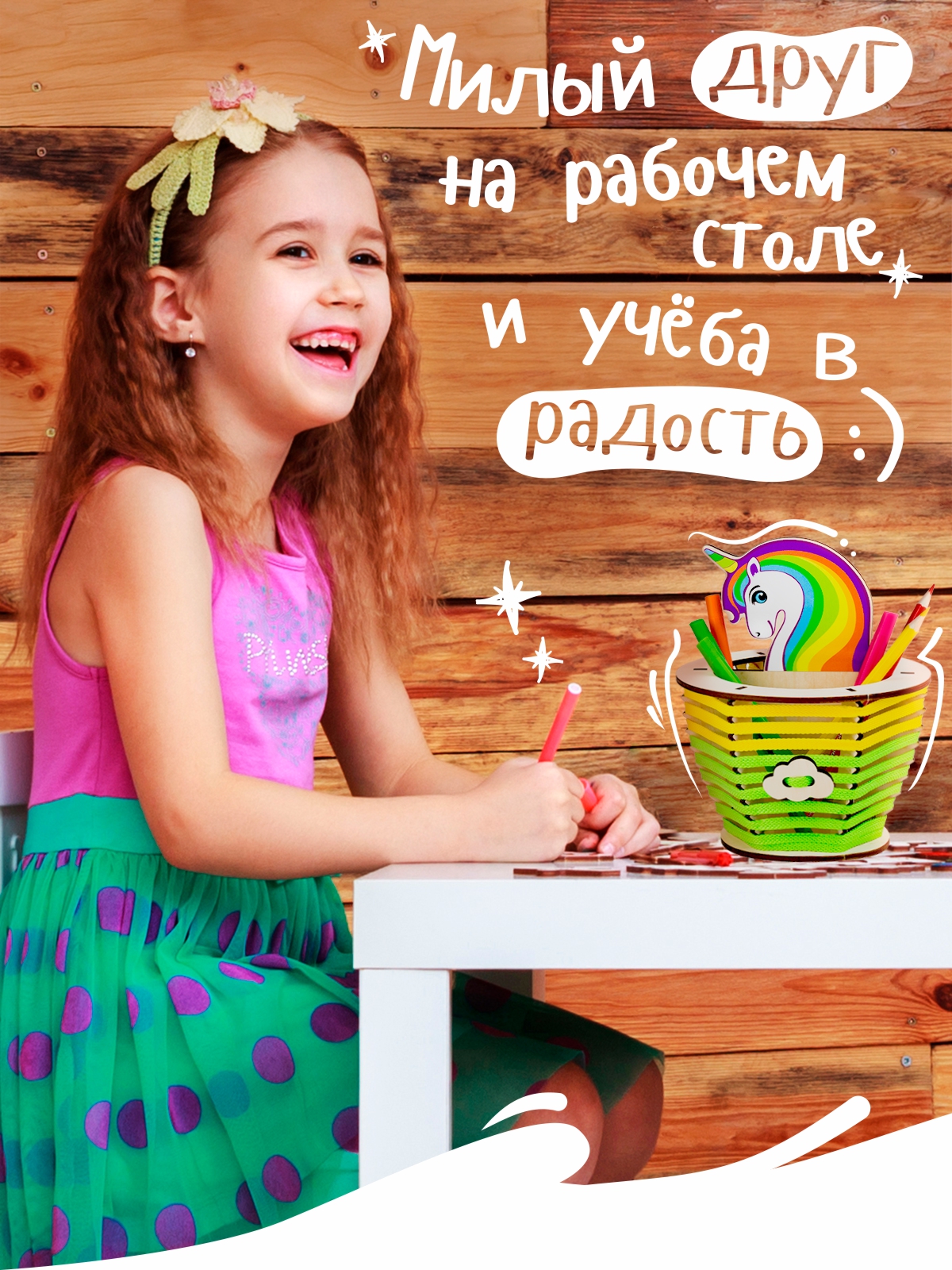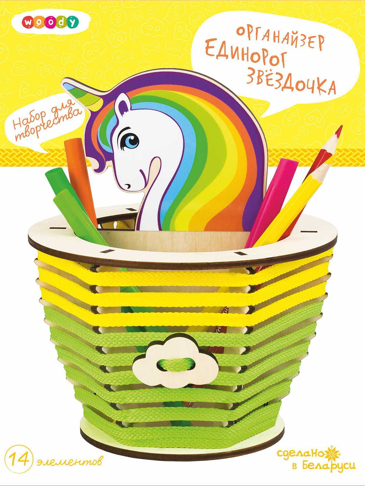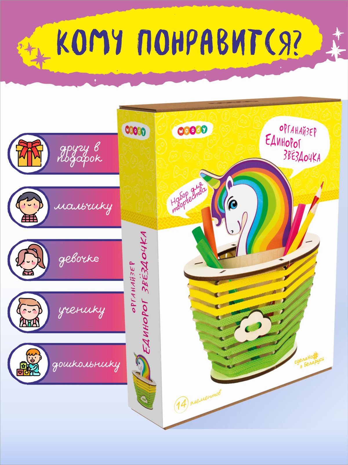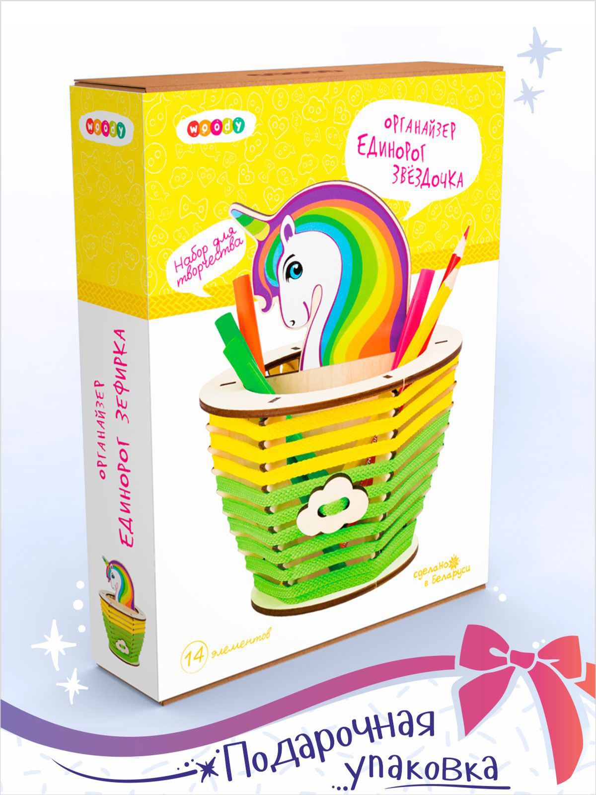 Милые единороги все больше завоевывают внимание детей и взрослых. Это образ сказочной красоты, доброты и мира фантазий. Органайзер «Единорог Звездочка» погружает в творчество детей от 6 лет, и позволяет найти уникальный и просторный домик для важных канцелярских принадлежностей. Основа набора выполнена из дерева – натуральный гипоаллергенный материал, который можно украшать по своему вкусу: разукрашивать карандашами, фломастерами, гуашью или акрилом; приклеивать бусинки, пайетки, стразы или разукрашенные крупы; декорировать объемными формами из пластилина.