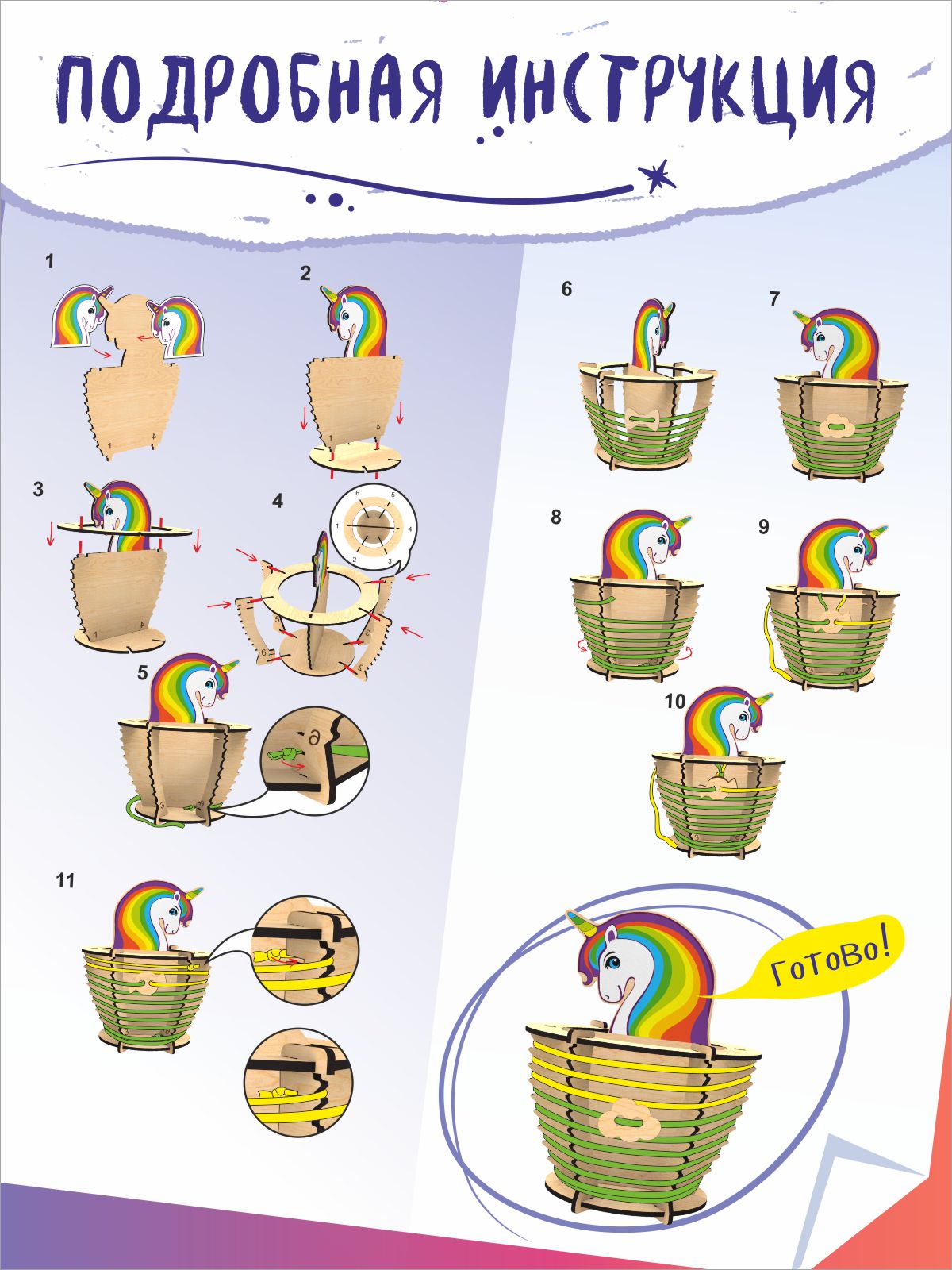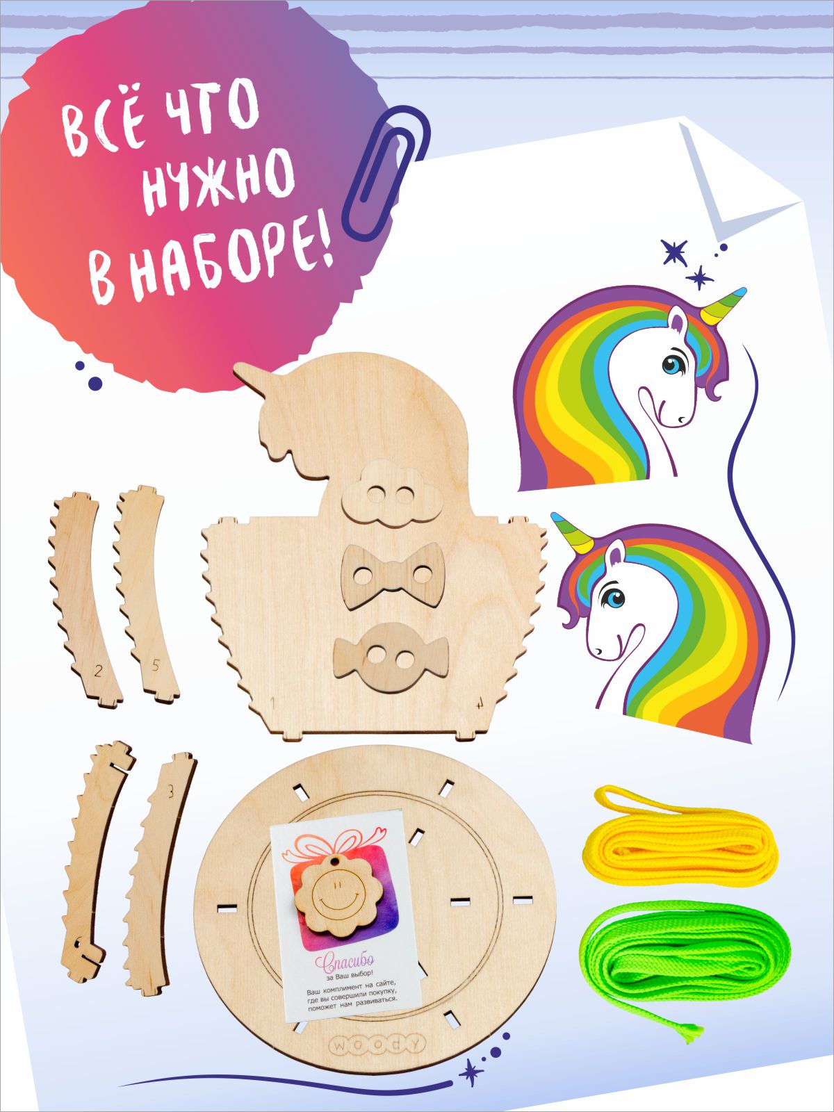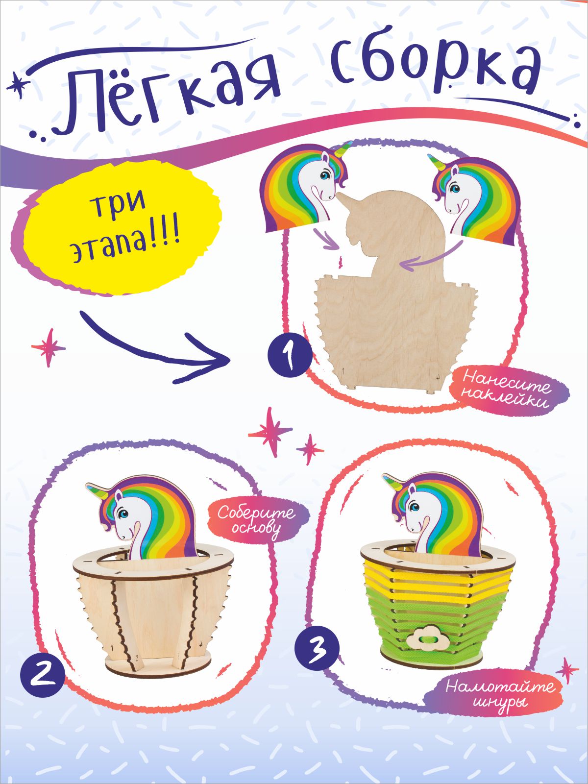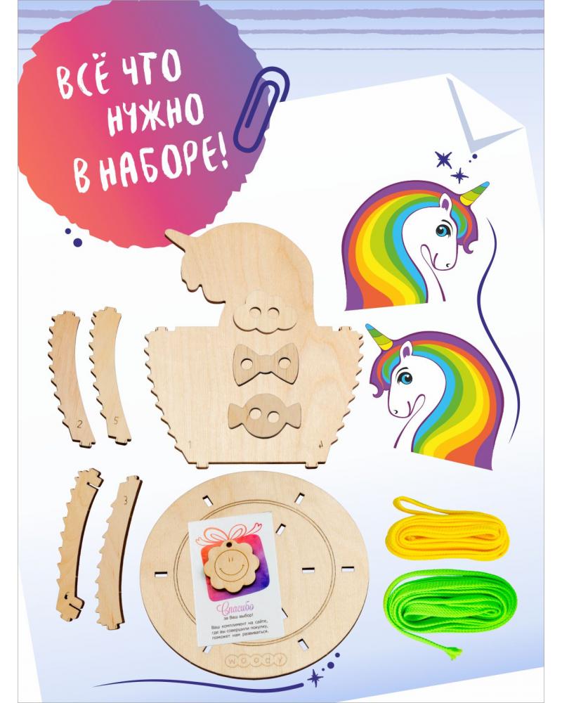 1. Открываем упаковку, по инструкции наклеиваем ламинированные наклейки с ярким единорогом с двух сторон. При желании, можно использовать наклейки отдельно, а деревянную область для наклеек украсить по своему желанию или придумать новый образ сказочной зверюшки.