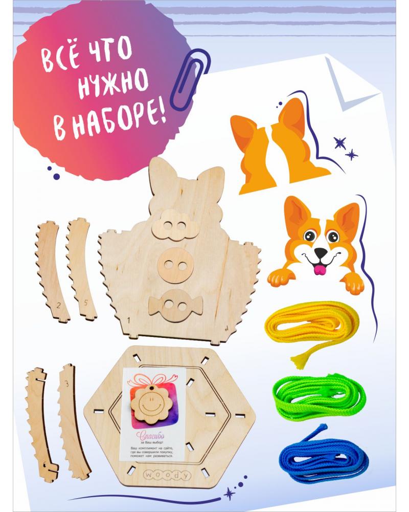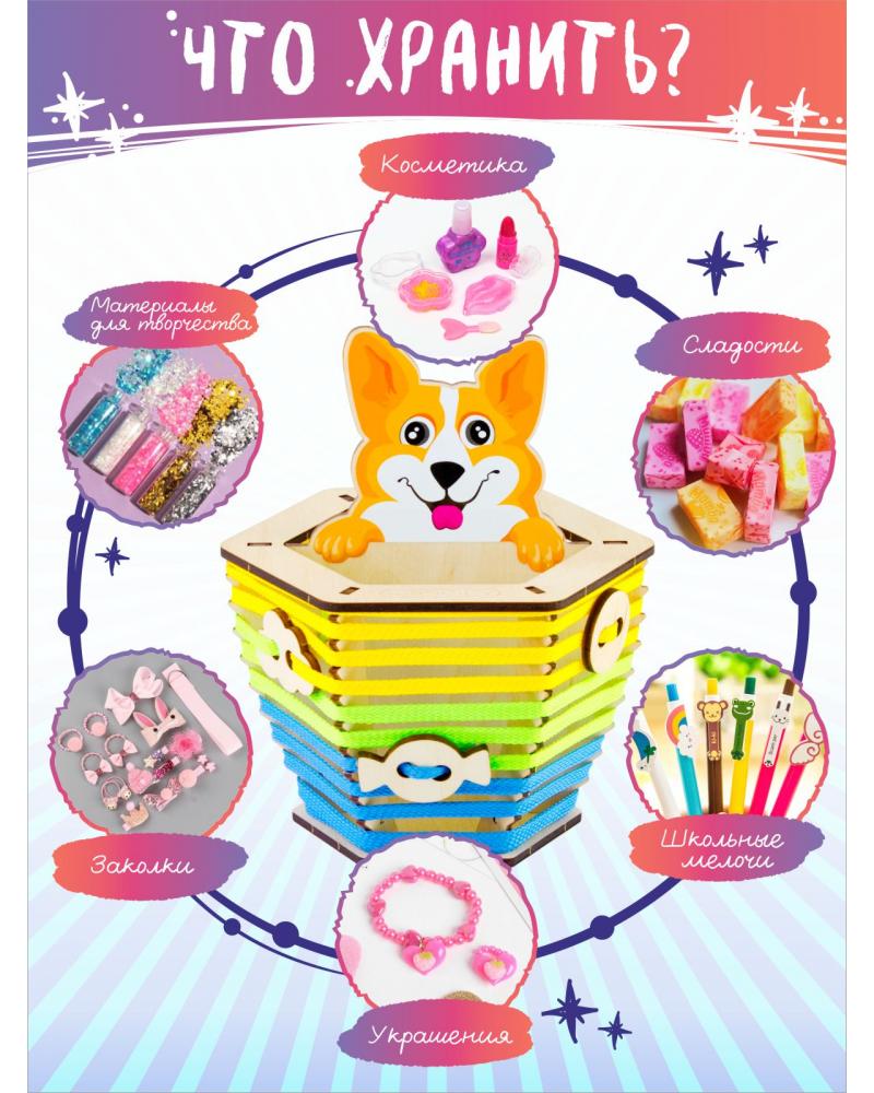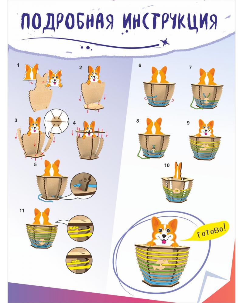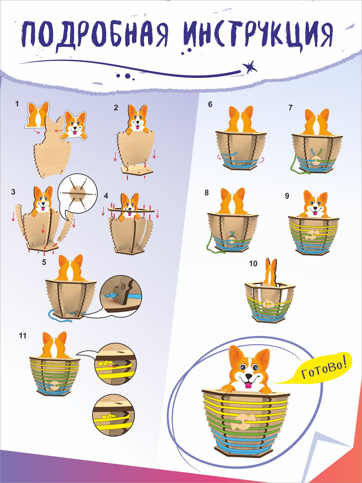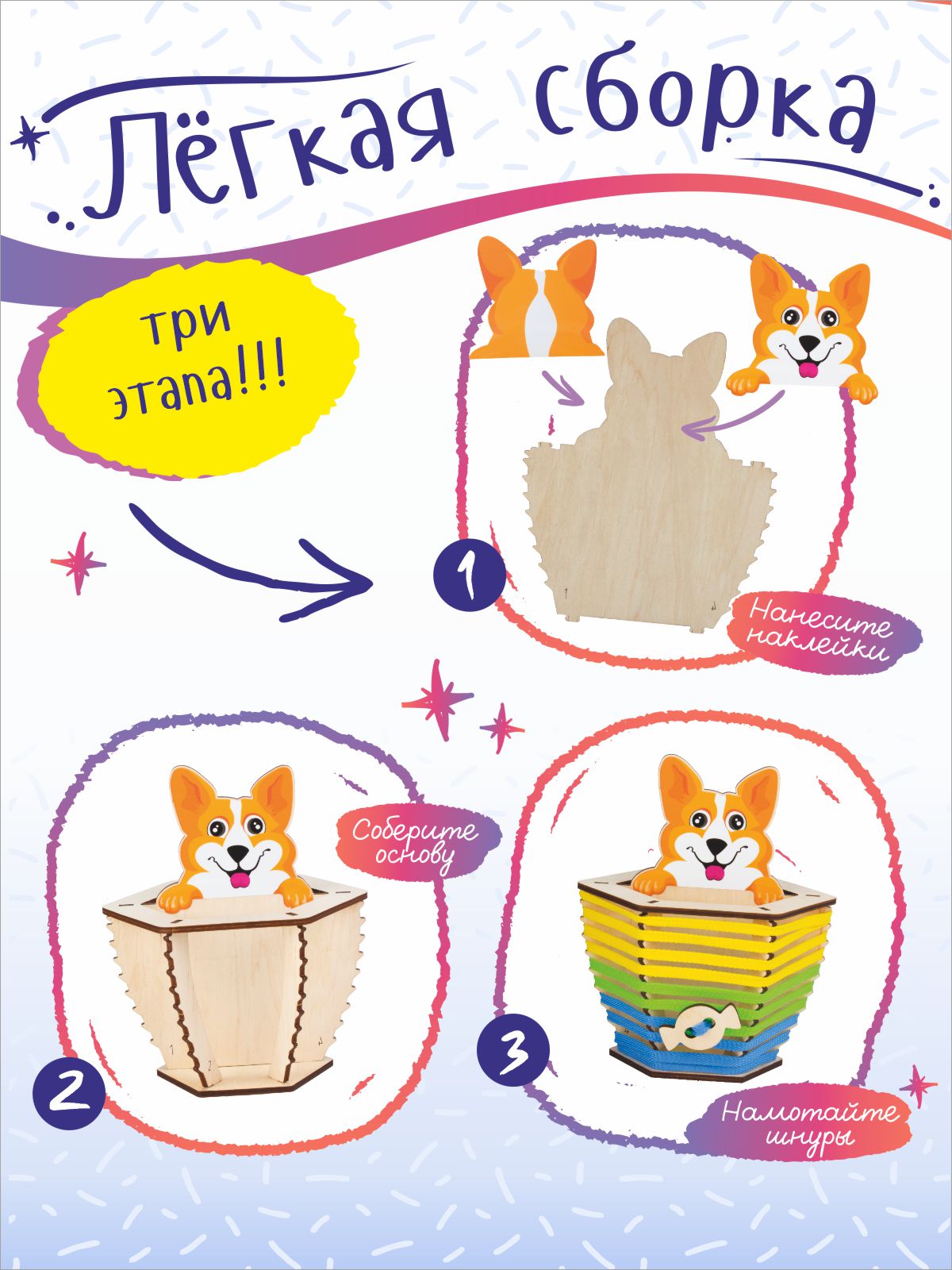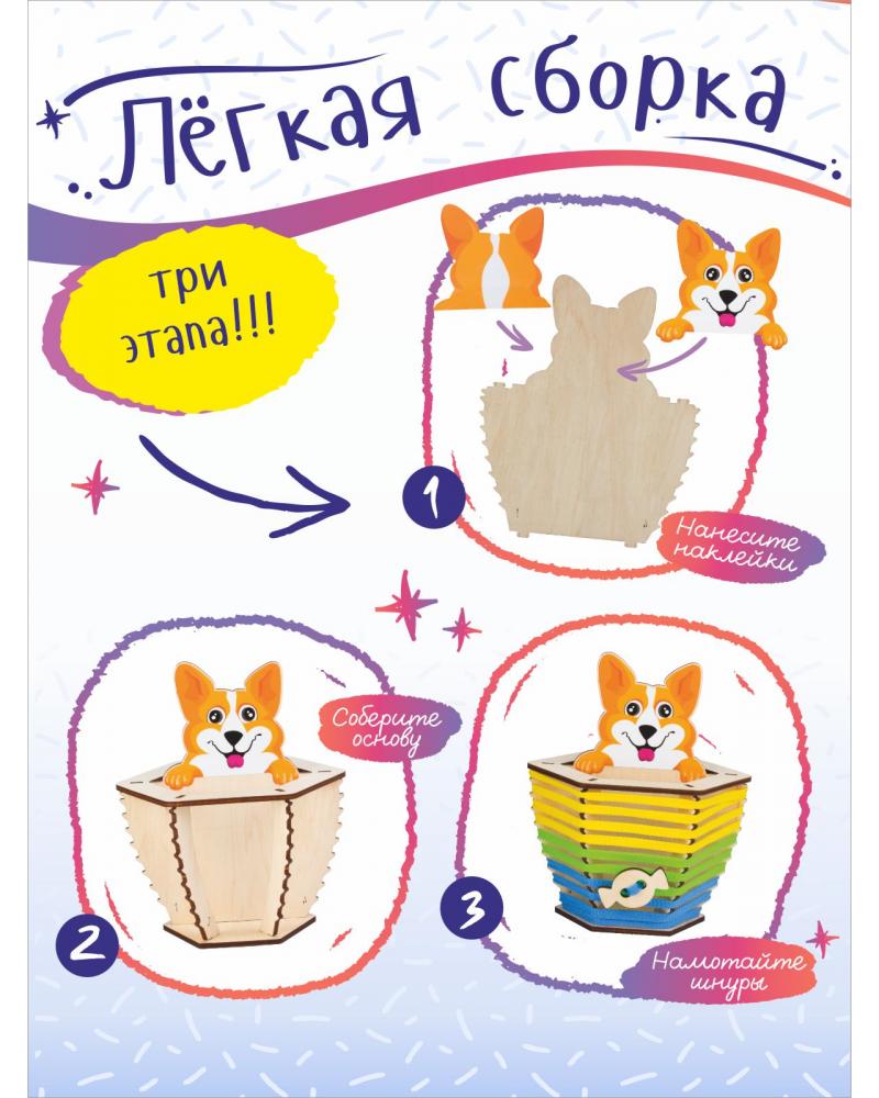 Перед началом сборки набора, приклеиваем яркие ламинированные наклейки с милым корги с обеих сторон деревянной основы (по желанию, вместо наклеек можно разукрасить это пространство, а наклейки использовать отдельно). Затем приступаем к сборке конструкции, собирая деревянную основу по инструкции как конструктор. Для украшения тканевых шнуров отлично подойдут деревянные элементы, которые входят в набор: кружок, облако и конфетка. Для пропорционального и ровного наматывания шнуров, в стенках основы органайзера предусмотрены специальные засечки.