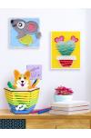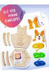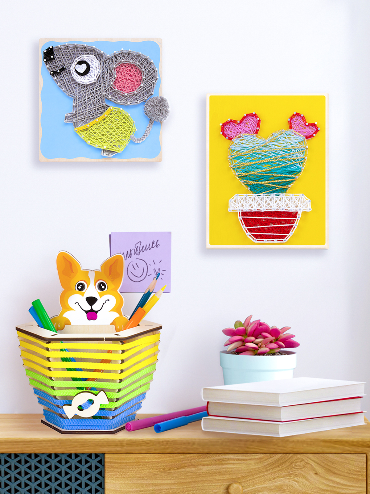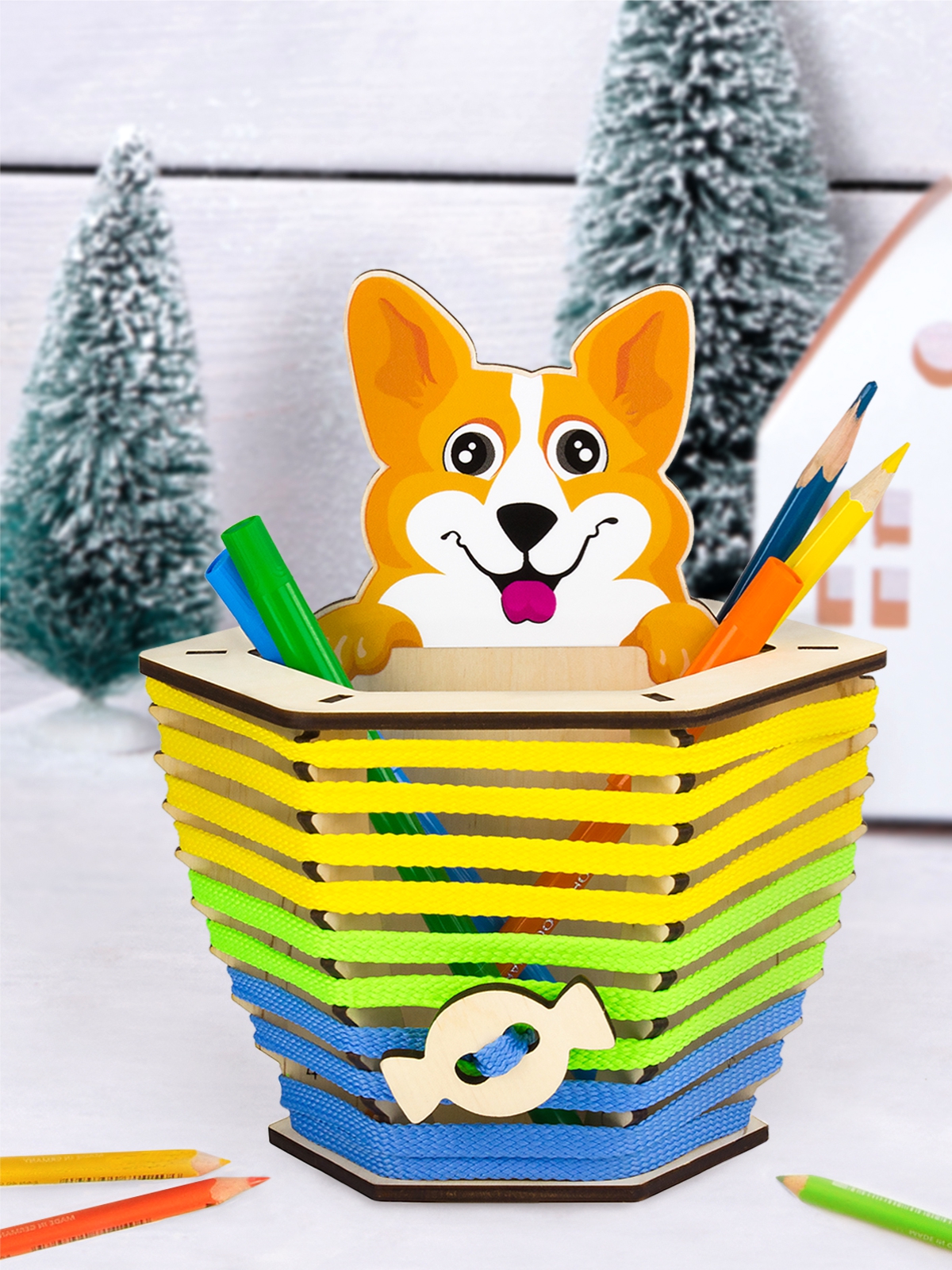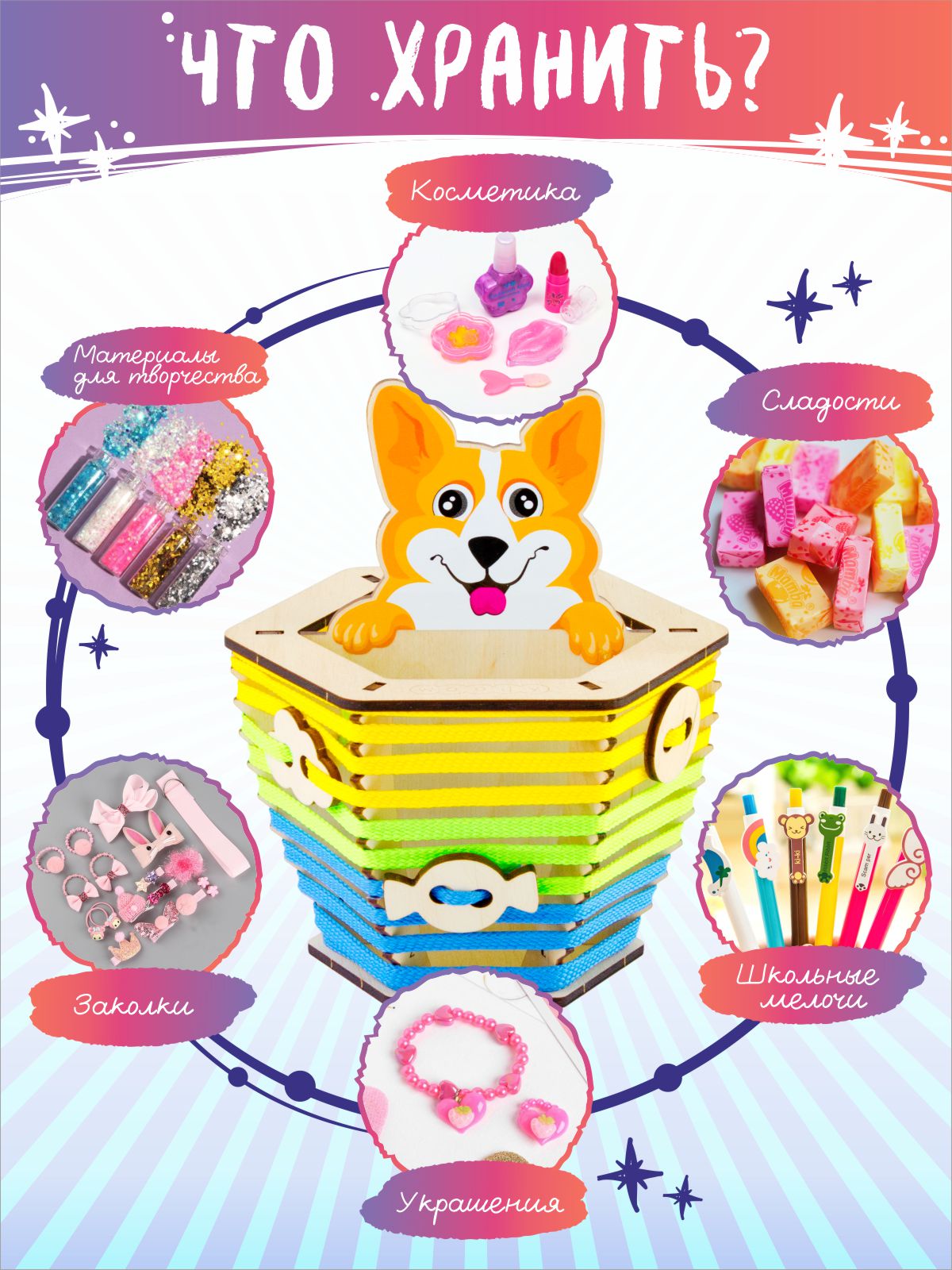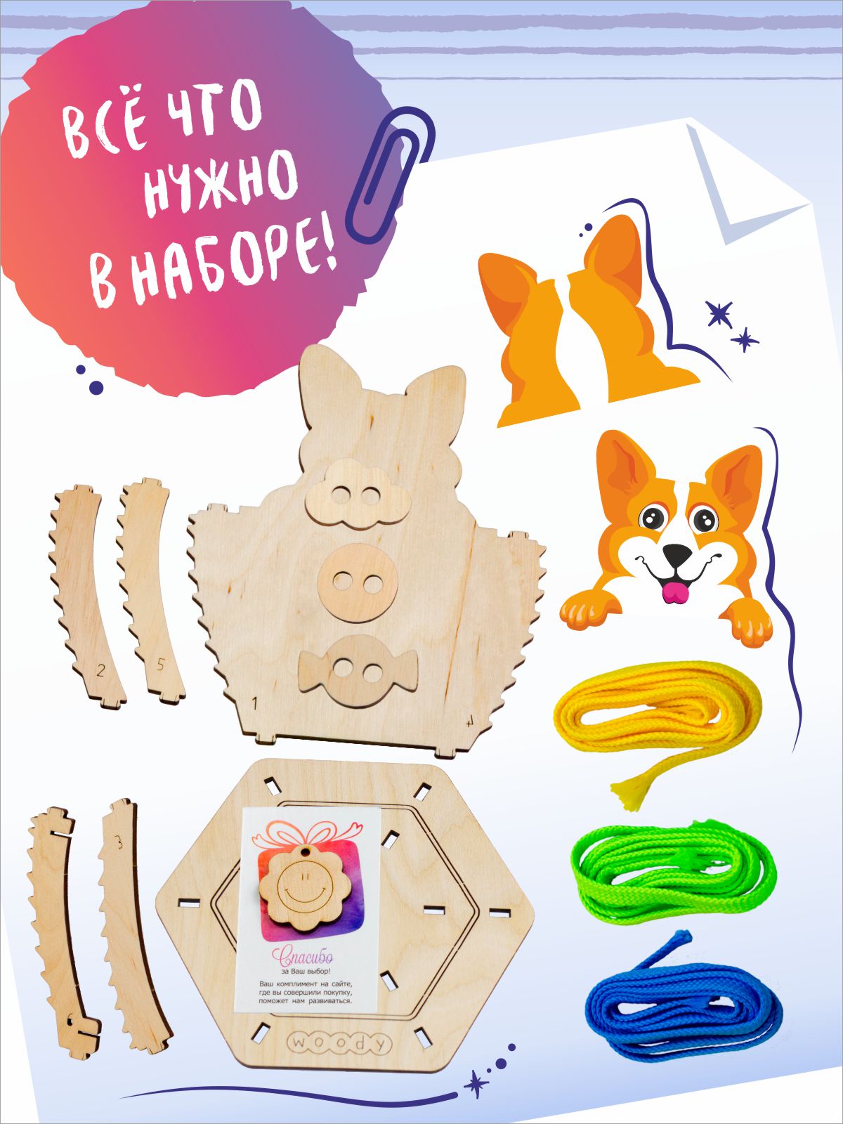 Перед началом сборки набора, приклеиваем яркие ламинированные наклейки с милым корги с обеих сторон деревянной основы (по желанию, вместо наклеек можно разукрасить это пространство, а наклейки использовать отдельно). Затем приступаем к сборке конструкции, собирая деревянную основу по инструкции как конструктор. Для украшения тканевых шнуров отлично подойдут деревянные элементы, которые входят в набор: кружок, облако и конфетка. Для пропорционального и ровного наматывания шнуров, в стенках основы органайзера предусмотрены специальные засечки.